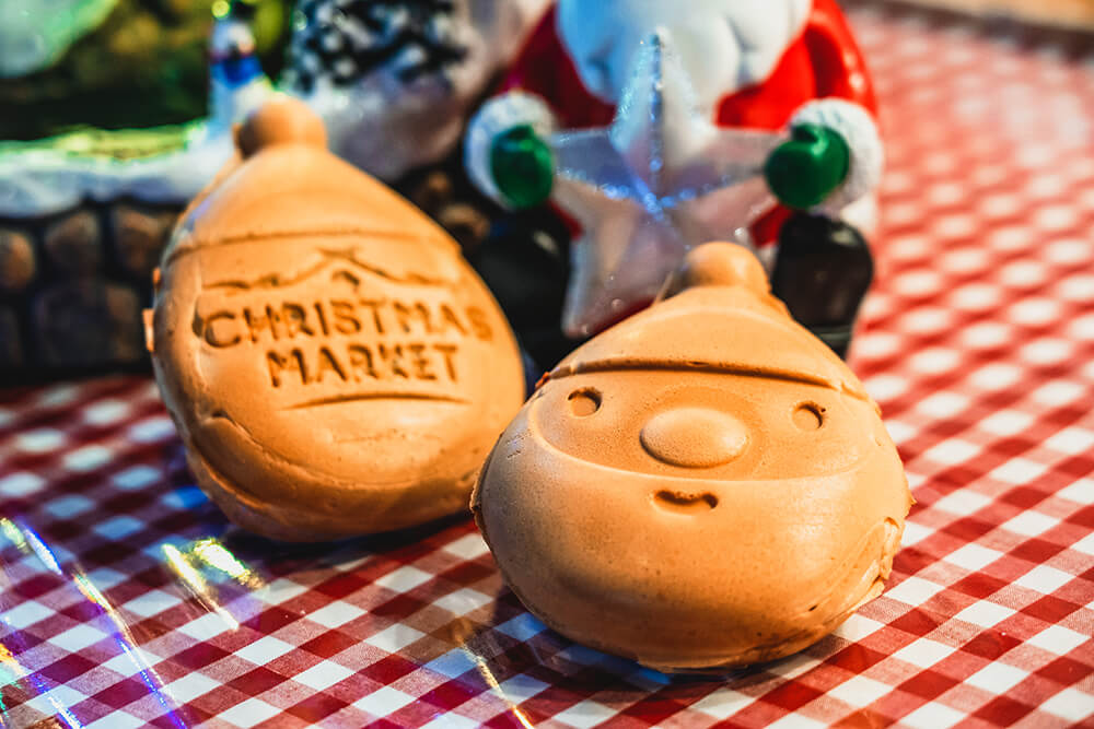 目玉はクリスマスアドベント公式キャラクター「さんちゃん」の人形焼きや粗挽きの豚肉を絶妙に配合し、パリッとはじける皮と芳ばしい旨みが魅力の「ぐるぐるソーセージ」です。