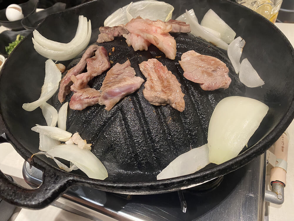 大量に頼んだ玉ねぎとともに鉄板でじっくりと焼いていきます。すでに香ばしい香りに期待が…。