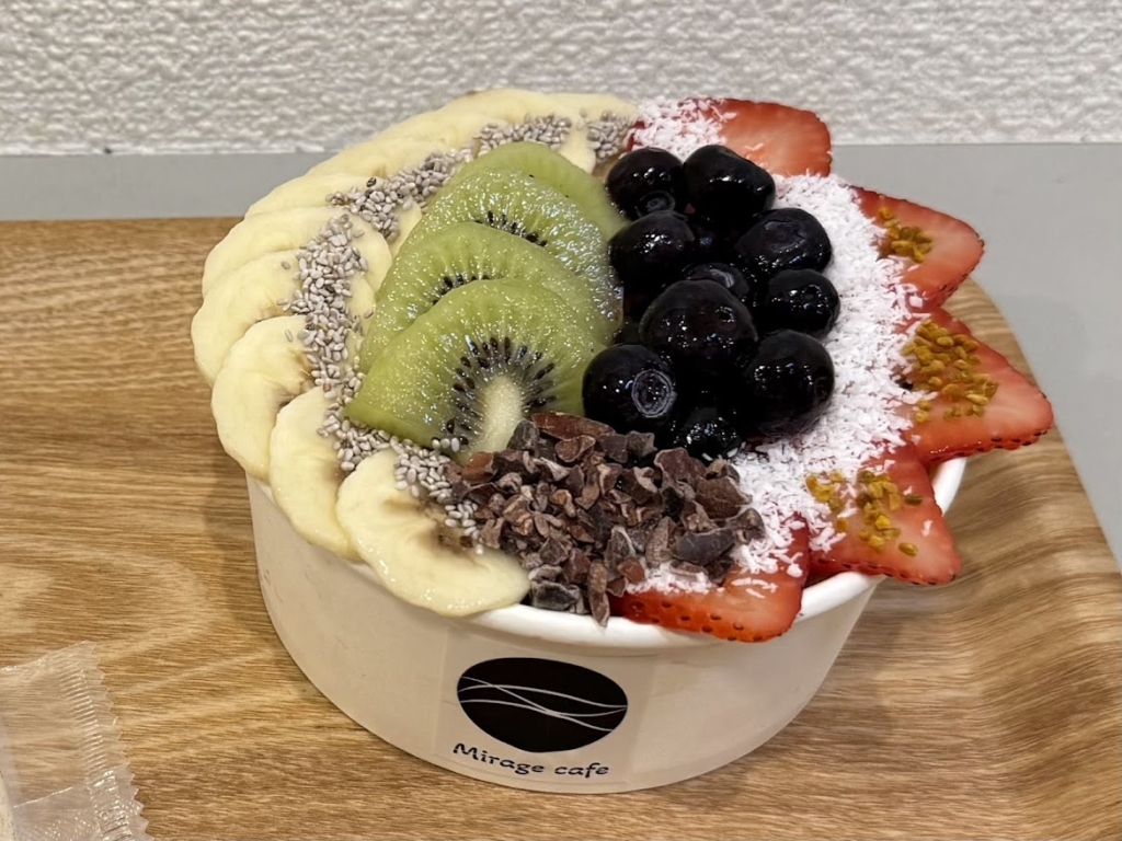 「mirage cafe(ミラージュカフェ)」は、無糖のアサイーと数種類のフルーツをミックスした独自製法のアサイーベースに、高品質のフルーツを使用したアサイーボウルが自慢のカフェです。