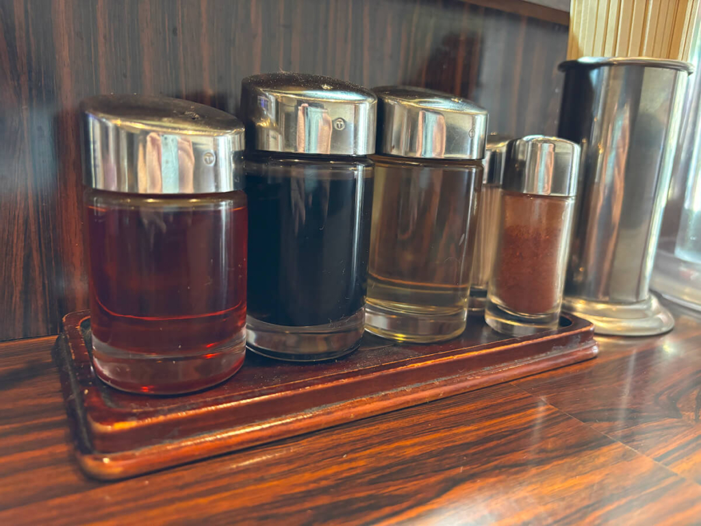 卓上には、ニンニクやお酢などの調味料が7種類ほど置かれており、とても充実しています。カスタマイズの幅がかなり広く、同じラーメンを注文していても、行くたびに違った楽しみ方ができるのも、長山の魅力です。