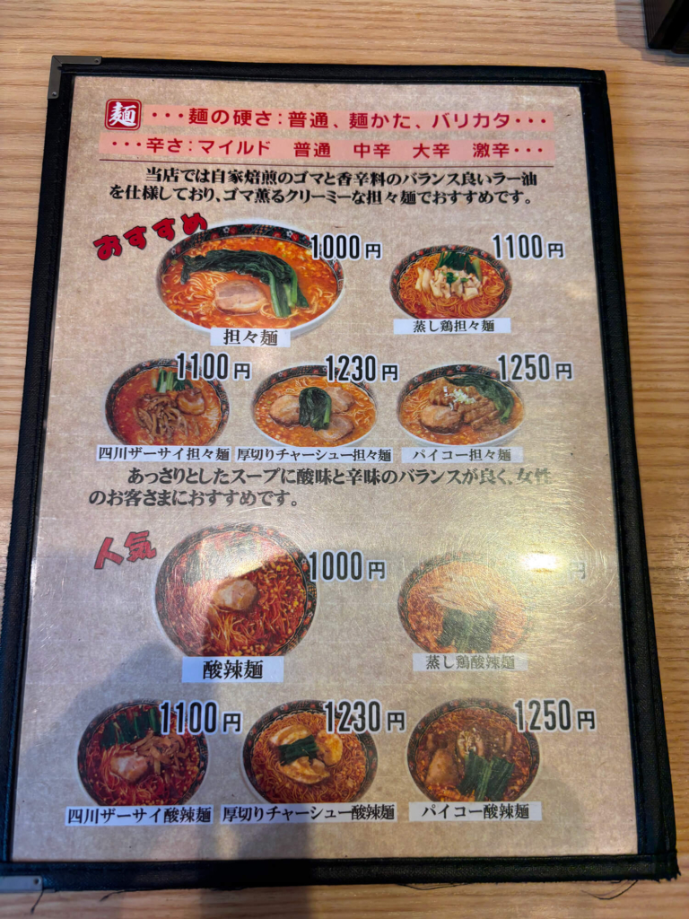 看板の担々麺は、胡麻のコクとほどよい辛さが特徴で、いわゆる“ただ辛いだけ”ではない、奥行きのある味わいが楽しめます。