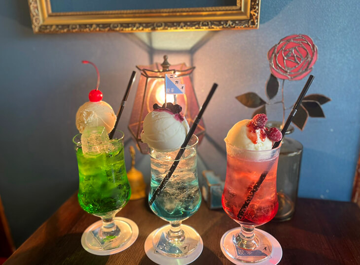 名物のクリームソーダは、フレーバーのバリエーションが豊富で、自分好みのアイスをトッピングできるのが魅力。