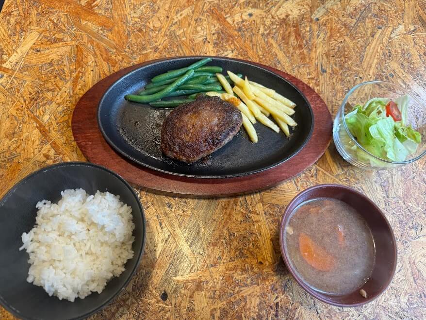 ハンバーグランチは、ハンバーグ、ライス、ミニサラダ、豚汁がセットになっています。