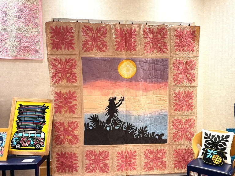 会場では、ハワイアンキルトをはじめとするアート作品の展示・販売も行われるとのことです。カラフルなキルトやサーフボードのアートに囲まれた空間は、まさにハワイのギャラリーのようですね。
